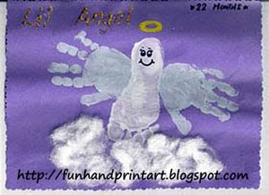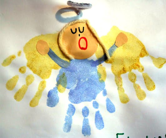 Eu achei muito linda e criativa estas ideias... Anjinho com carimbo somente das mãozinhas e rostinho feito com papel ou EVA.