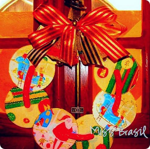 Enfeite para porta, do Happy Batatinha. Feito com reciclagem de cd's e decoupage de guardanapos. Mas você pode fazer também com colagem de papel de presente com motivos natalinos ou cartões de natal antigos, fica lindo!