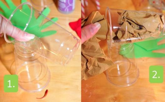 Os copos foram preenchidos com papéis amassados, mas você pode usar retalhos de tecido, eva ou guloseimas. Eu apostaria nas guloseimas!